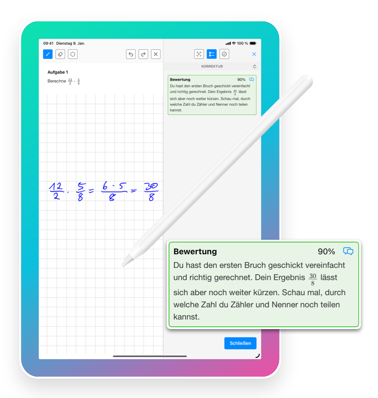 Fotografiere Aufgaben mit dem iPad, bearbeite sie handschriftlich mit deinem Stift und verbessere sie mit KI-Feedback.